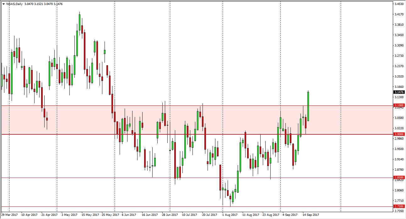 The natural gas markets exploded to the upside, finally breaking above the $3.10 level. This is an area that has been reliable resistance going back to the end of May, and because of this, I feel that we have turned the corner. By breaking above the $3.10 level, I think that we are going to continue to see bullish pressure, but I do recognize that there is a lot of noise at the $3.20 level just above. Short-term traders will probably buy pullbacks, if we can stay above the $3.10 handle. If we were to break down below the $3.10 level, that would just continue the noise that we have seen recently, and therefore make this a market that would be almost impossible to deal with. In the short term though, looks as if the buyers are going to have their way in the natural gas paths.