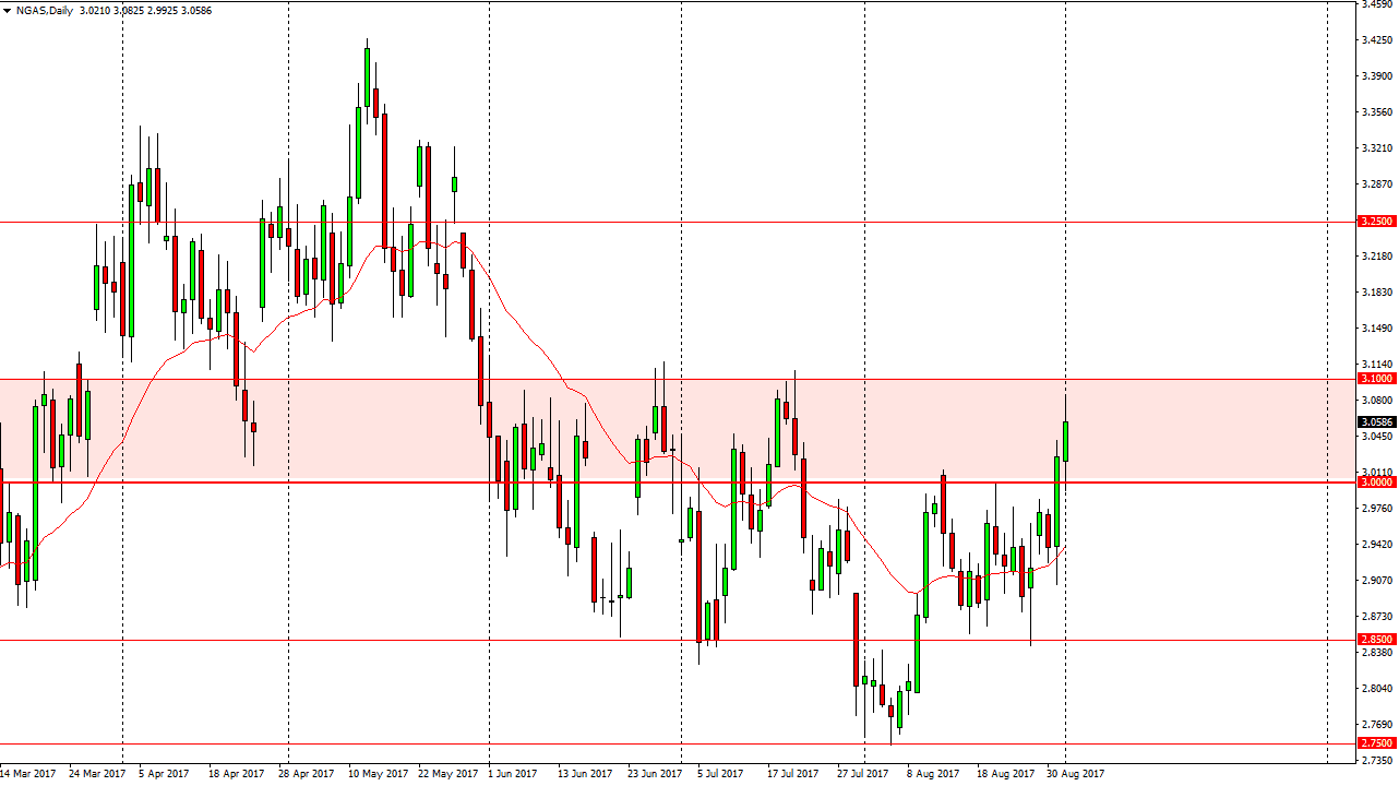 Natural gas markets were very volatile during the Friday session, as we pulled back to the $3 level, and then exploded to the upside. The $3.10 level above seems to be massively resistive, but I think we will try to test that level. Ultimately, any type of resistance at that area could be a nice selling opportunity, but if we break out to the upside, the market should then go to the $3.25 level. If we break down below the $3 level, the market will continue to go lower. Where in a longer-term downtrend but I think a lot of this noise from hurricane Harvey will wear off eventually, and when it does we should have a nice selling opportunity. Until then, it’s likely that we will see a lot of choppiness of volatility, with the possibility of a short-term burst higher. I still believe in the longer-term negativity of this market, and therefore I’m not interested in trying to fight it, but rather would be more interested in waiting for exhaustion to jump on.