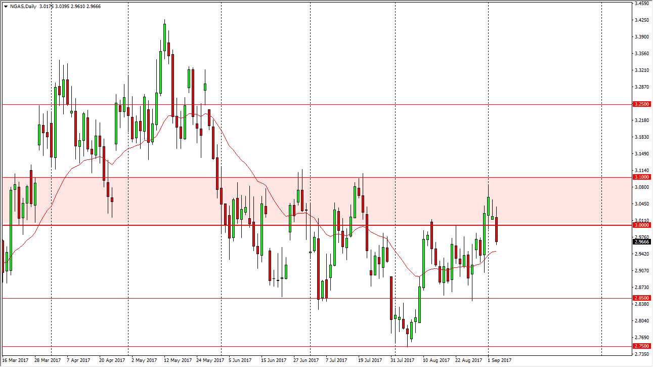 Natural gas markets initially tried to rally, but just as we did on Monday, the sellers jump into the market and started pushing the contract lower. Not only that, but we have broken significantly below the $3 level. I think that the markets probably going to go looking for the $2.85 level over the longer term, but there so much noise underneath that I would anticipate that the volatility will be fairly strong. There’s a lot of chatter by retail traders that this market could turn around due to the hurricane, but right now it does not look like the hurricane is can come anywhere near disrupting the natural gas markets. Because of this, I think that the resistance barrier between the $3 and $3.10 level continues to be the top of the range that we are trading in, and that we will eventually go lower. It’s possible may be trying to form some type of bottoming pattern, but we have a long way to go before the trend would change. With over 300,000,000,000,000 ft.³ of proven natural gas in the ground in America, any rally is can be short-lived.