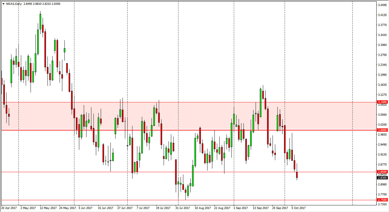 Natural gas markets initially tried to rally during the day on Monday, but found the area above the $2.85 level to be far too resistive to continue to go higher. We ended up forming a bit of a shooting star at the bottom of a downtrend, and that normally means that we are going to continue to see selling pressure. I think that we will go down to the $2.75 level underneath, which has been massively supportive in the past. The market is obviously broken, and therefore I think that even if we do rally from here, it’s only a matter of time before we see exhaustive price action that we can start shorting. If we can break down below the $2.75 level, then I think we go down to the $2.50 level next.