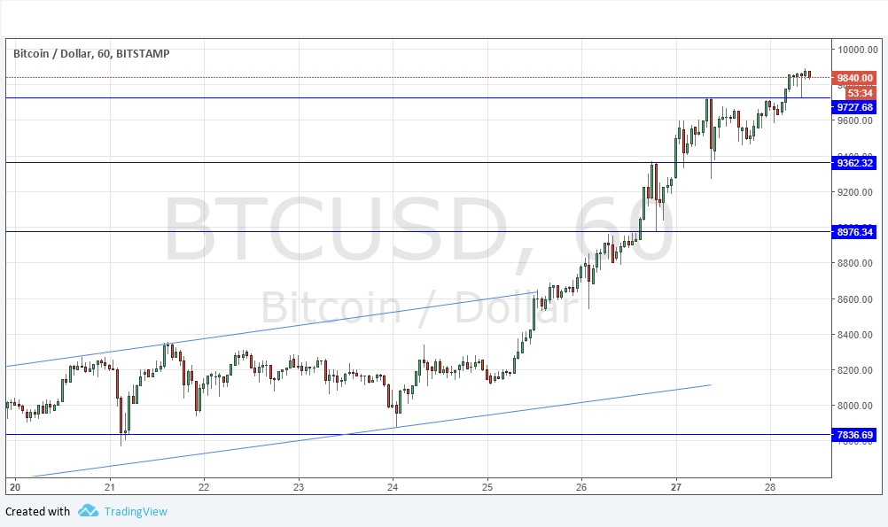 Yesterday’s signals produced a profitable long trade following the bullish inside hourly candle rejecting the support level identified at $9362.32. It would probably be wise to take profit now if that has not already been done as there is likely to be considerable price turbulence if $10,000 is reached.