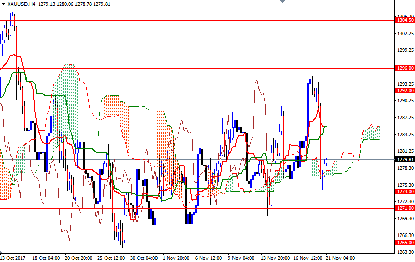 In that case, the market will be targeting the 1285.60 level, the confluence of the Tenkan-sen (nine-period moving average, red line) and the Kijun-sen (twenty six-period moving average, green line) on the H4 chart. Penetrating that barrier paves the way for a test of 1288. If the bears, on the other hand, successfully drag prices below the 1274 level, we will probably visit the support at 1271. The market has to get down below there in order to continue to the downside and test 1265 and 1260.