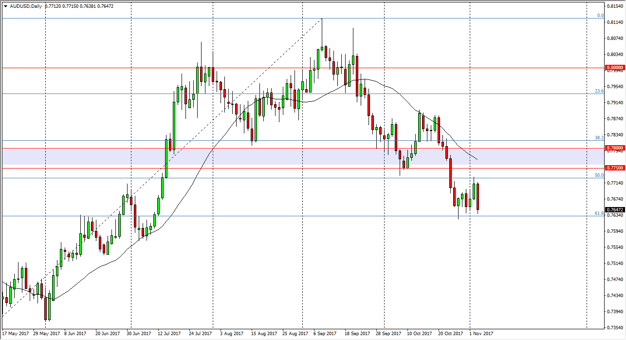 The Australian dollar fell significantly during the day on Friday, reaching down towards the 61.8% Fibonacci retracement level again, near the 0.7650 level. If we can break down below there, the market should then go to the 0.75 level underneath, as it is the next major support level from both a psychological and structural standpoint. Rallies of this point should continue to be selling opportunities, as I see a significant amount of resistance near the 0.7750 level, extending to the 0.78 level. I think that any type of exhaustive candle in that area could be a nice selling opportunity as it offers value in the US dollar. However, if we were to break above that area we could go as high as the 0.80 level. Overall, this is a market that continues to see volatility but until Gold helps as well.