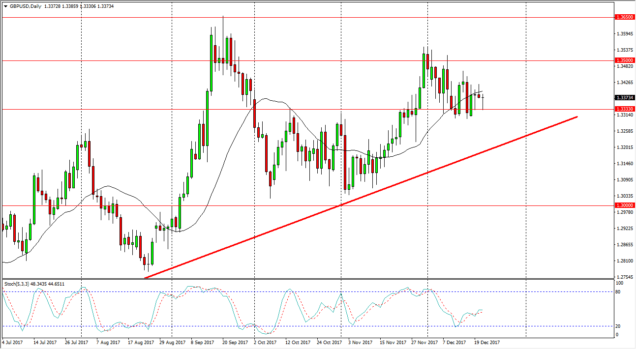 The EUR/USD pair went back and forth during the day on Thursday, as we have reached a recent high, causing the market to pull back ever so slightly. I think that given enough time, we will break out, but in the meantime, I’m looking at short-term pullbacks as potential buying opportunities. The market sees a significant amount of resistance at the 1.20 level above, and most certainly the 1.21 level as it was the recent high. I don’t have any interest in shorting this market, because when I look at the weekly charts it looks as if we are forming a bit of a bullish flag. That of course signifies that we’re going to go higher, and I believe that some time over the next year or 2 we will go to the 1.32 handle. However, a not going to do that today, so it’s likely that we will bounce around with an upward proclivity.