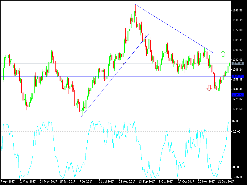 If gold manages to test the resistance at 1283 an ounce, the highest level for the precious metal in 3 weeks, it would be a good chance for it to move towards the psychologically important peak at 1300. Gold took advantage of the US index, which measures the greenback’s strength against a basket of 6 currencies, retreating towards 93.20, and the drop of the US stock market, to achieve gains. Gold is moving within upward channel as shown on the daily chart, but within tight ranges, even with the strong pressures on the dollar after the passage of the US tax cut bill. It seems that the increased move towards crypto-currencies after the recent record gains, especially the for the Bitcoin, contributed to reduced interest in buying gold, as the recent gains were lower than usual in light of a lower dollar.