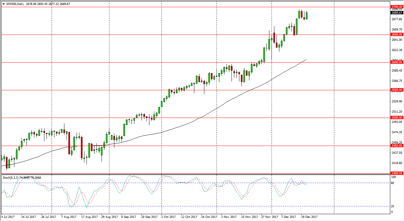 The S&P 500 rallied a bit during the trading session on Thursday, on light volume. We are continuing to see buyers jump into this market and push towards the 2700 level, but having said this, it’s going to be a short trading session during the day, and volume will be almost nothing. Because of this, I would stay out of the market, but I do recognize that a break above the 2700 level would be a very bullish sign, and perhaps send this market to the upside. A break above there does send the market much higher over the longer term, and I think it will happen given enough time. But I also recognize that we can pull back between now and then, looking towards the support at the 2650 handle. That’s an area that I think will attract a lot of value hunters, but right now we are simply focusing on the holidays, and not the markets.