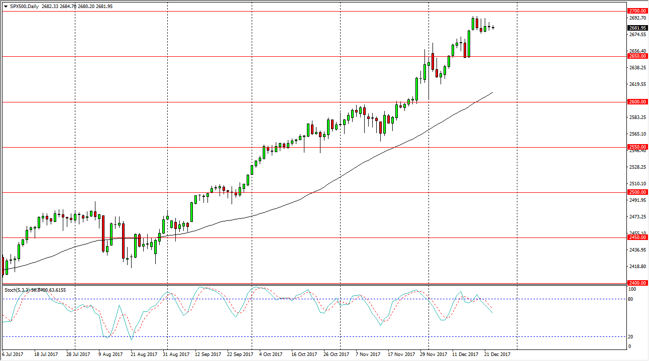 The S&P 500 barely moved during the trading session on Tuesday, which of course wasn’t overly surprising considering that the session was the first day after Christmas. Volume is going to be very thin, and at this point I think it’s very likely that we could pull back. The pullback should find plenty of support near the 2650 level though, so pay attention to these pullbacks as potential buying opportunities. The market will be very thin, and therefore the moves won’t be reliable. I think that the market rolling over makes sense, because quite frankly nobody’s going to be wanting to jump in and initiate a large position at this point. Even if we were to break down below the 2650 level, I think there is more than enough support underneath to keep this market bullish as well. The 2600 level underneath is a massive floor.