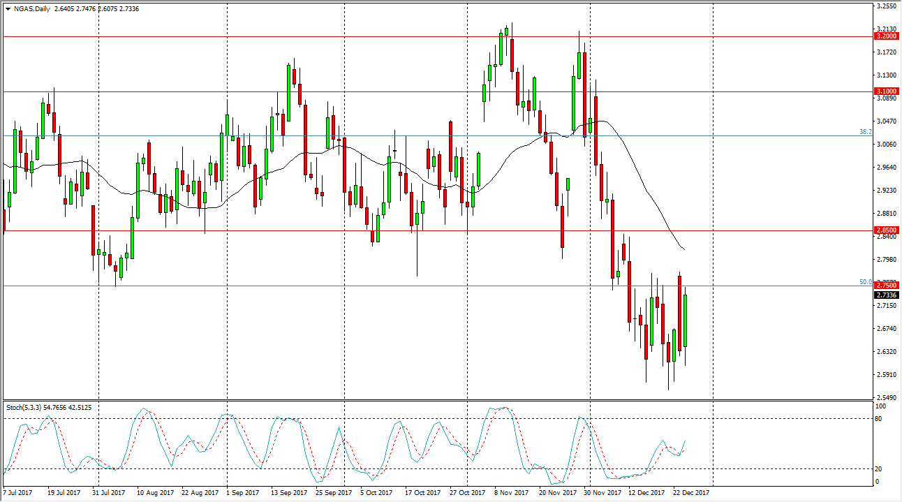 Natural gas markets rallied significantly during the day on Wednesday, after initially dipping. The bullish move slammed into the $2.75 level, but as you can see pull back slightly. It looks as if we’re going to continue to consolidate in general, so I think short-term trading back and forth is probably the best way to look at this market. If we can break above the $2.75 level, it’s likely that we will find even more resistance at the $2.85 level. That’s an area that of course is going to be an area that I would look to sell on signs of exhaustion, but I would do so on short-term charts. I believe that the negativity in the market over the last couple of months has been quite brutal and telling, considering that we are in the coldest part of the year in the northeastern part of the United States, and cannot keep rallies going for any length of time.