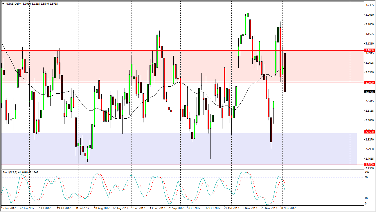 The natural gas markets initially gapped higher during the trading session on Monday, but then rolled over significantly to break below the $3.00 level. It looks as if we are trying to fill the gap from about a week ago, so I think at this point we will probably find a little bit of a bounce, but if we do continue to go lower, then we are more than likely to go down to the $2.85 level underneath, which is the beginning of massive support on the longer-term charts. I believe that the market should continue to go back and forth in general, as we are in a situation that we have oversupply, but we are also in the middle of the high demand season in the United States. Because of this, I believe that we stay within the consolidation area, and therefore I think we go a little bit lower, then bounce, and then break down again.