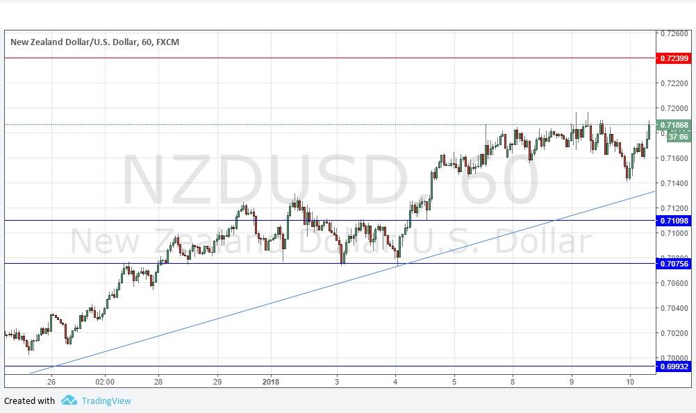 I was correct yesterday to be bullish on this pair, as it continues to show upwards movement over recent hours and threaten to take out the recent highs soon. The NZD is clearly more bullish than the AUD which is significant. The price did not pull back to reach a key level or even the trend line before taking off again: instead it made a double bottom at about 0.7140. I maintain my bullish bias and right now it looks as if the price is heading for 0.7240. There is no reason not to be bullish over the coming hours between the supportive trend line and that next resistance level. Beware if you are trading this pair at the start of the next Asian session, as there is a key Australian data release which could also strongly influence the NZD if there is any major surprise.