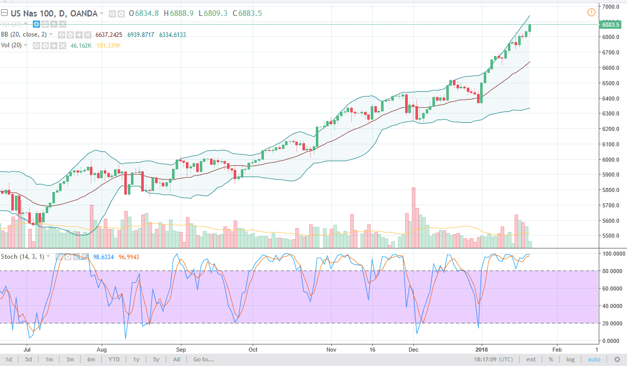 We are bit overextended, but any pullback at this point should offer value that most traders are willing to take advantage of. The NASDAQ 100 has been a bit of a laggard until recently, and it looks now as if it is going to lead the rest of the indices in America higher.