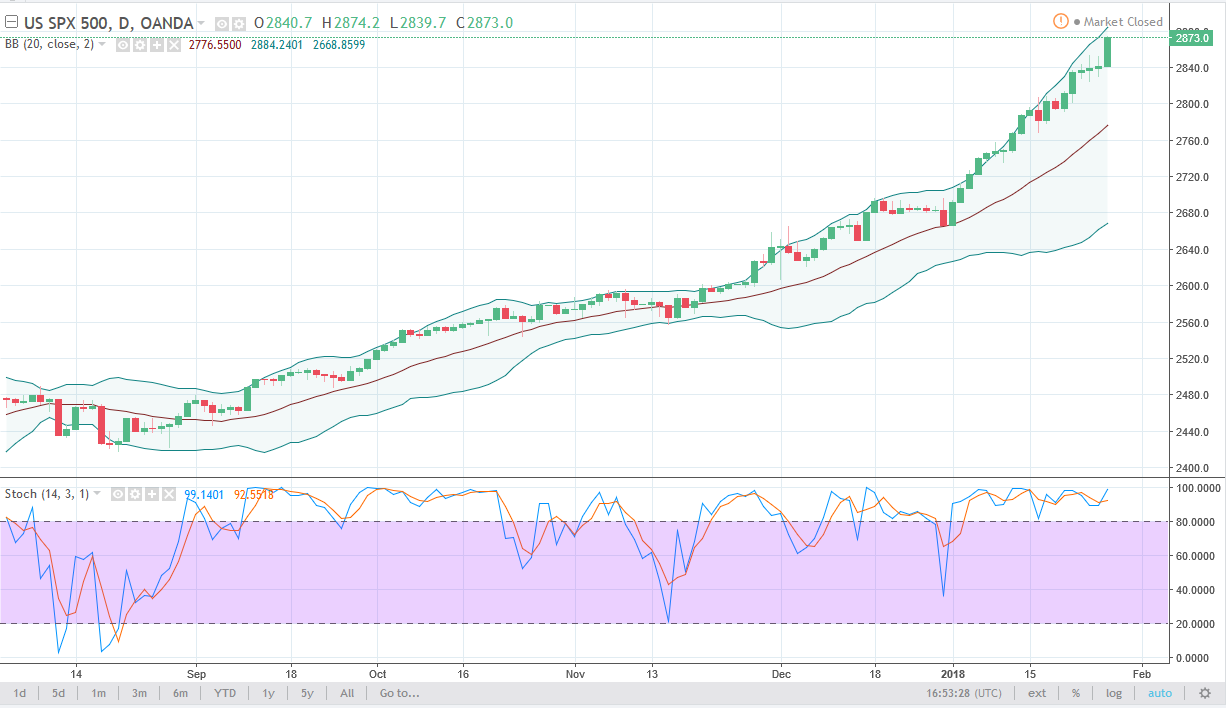 The S&P 500 has rallied significantly during the day on Friday, breaking above to a fresh, new high yet again. It looks as if we are going to reach towards 2900 rather soon, and although this is a very bullish market, it is a bit overextended, so I think we will get a sudden burst, and that a pullback. Longer-term, I still have a target of 3000, and currently it looks as if 2825 is offering a bit of a floor. US markets continue to look very bullish, and I think will continue to do quite well in comparison to other indices around the world. I have no interest in shorting, and I think there is an absolute “floor” in the market at the 2800 level now. 3000 is all but assured sometime this year, but surprisingly - it might be in the next few weeks!