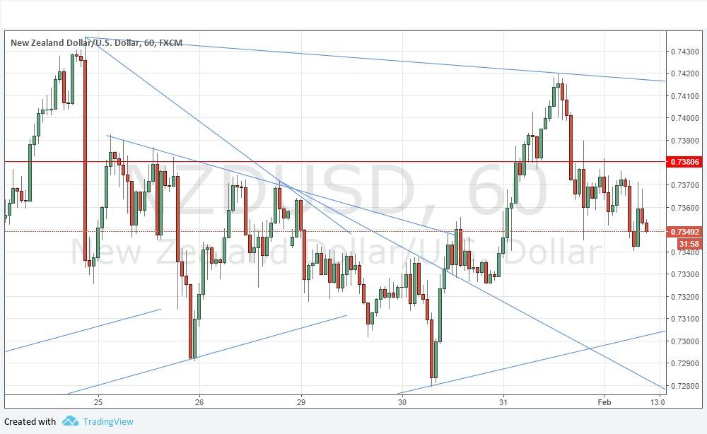 I had a bullish bias yesterday which turned out to be completely wrong, as the price sold off clearly and firmly, printing a new resistance level at 0.7381. A retrace to this level could produce another short trade opportunity, but the price action looks bearish and so we may well see the 0.7300 area first. If the price does get to the round number or close to it, it will have to retest the supportive ascending trend line in the area, which could be good for a long trade if it gives a convincing bullish bounce. In the very short term I have a slightly bearish bias, but no confidence in predicting any longer-term direction.