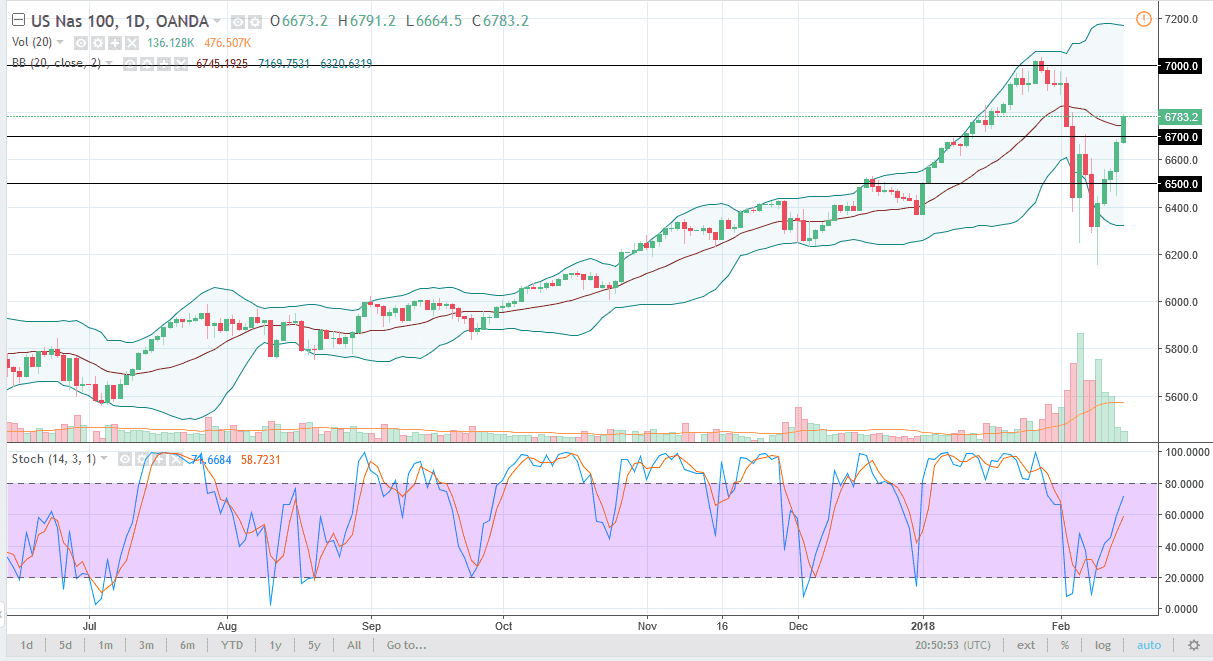 The NASDAQ 100 also broke out to the upside during the day and managed to clear the vital 6700 level. The 7000 level above is the longer-term target that I see, but I think short-term pullbacks will occasionally happen. The should be buying opportunities, as US stock markets in general look very likely to continue to see bullish pressure. If we can break above the 7000 handle, the market is very likely to continue to go much higher, perhaps reaching towards the 8000 level over the long term. In the meantime, I have no interest in shorting this market and I believe that the “floor” of the market is somewhere near the 6200 level. If we break down below there, the market could fall apart but I think we will continue to see money go flowing into New York and pushing the US indices higher.