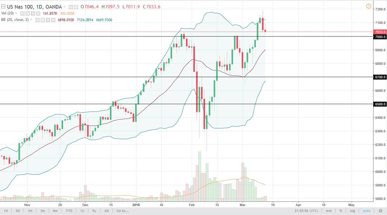 The NASDAQ 100 initially tried to rally during the trading session as well, but also rolled over to form a shooting star. The shooting star sits on top of the 7000 handle, an area that has previously been resistive. If we break down below that level, then I think we could unwind a bit more. However, if we were to turn around and break above the 7100 level, that would be an extraordinarily strong move, and should send this market to the highs again. I think the next couple of days will be crucial, so pay enough attention is going to be crucial. I think that at this point I would be sitting on the sidelines of the NASDAQ 100, but I will certainly find the signal after a daily close it shows some signs of conviction. I will keep you informed here at Daily Forex.