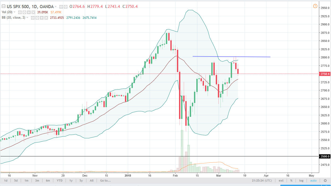 The S&P 500 initially tried to rally during the trading session on Wednesday but rolled over rather significantly by the end of the day. We ended up forming a bit of a shooting star, and we are sitting on support which is based upon the large, round, psychologically significant number, and of course an area that was previous resistance. The 2750 level will of course be an area where we need to pay attention to, but I think that the area below will eventually cause support. I have been short a couple of times over the last several sessions, but at this point I think it’s only a matter of time before the buyers come back into this market. I think there is plenty of support underneath, especially near the 2700 level. Alternately, if we turn around and break above the 2800 level, that should send this market much higher.