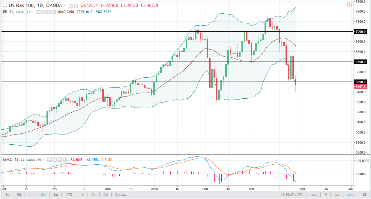 The NASDAQ 100 fell most of the day on Wednesday but found enough support at the 6400 level to turn around and form a bit of a hammer. The hammer of course is a bullish sign, and if we can break above the top of the candlestick for the day, I think the market will probably go towards the 6700 level. It’s going to take a significant amount of momentum to have that happen, but it would show that we have turn things around and found buyers again. I think that the market is trying to make a bit of a stand, but it may take a couple of days for the momentum to finally pick up and rally. I believe that the next major support level is somewhere near 6300