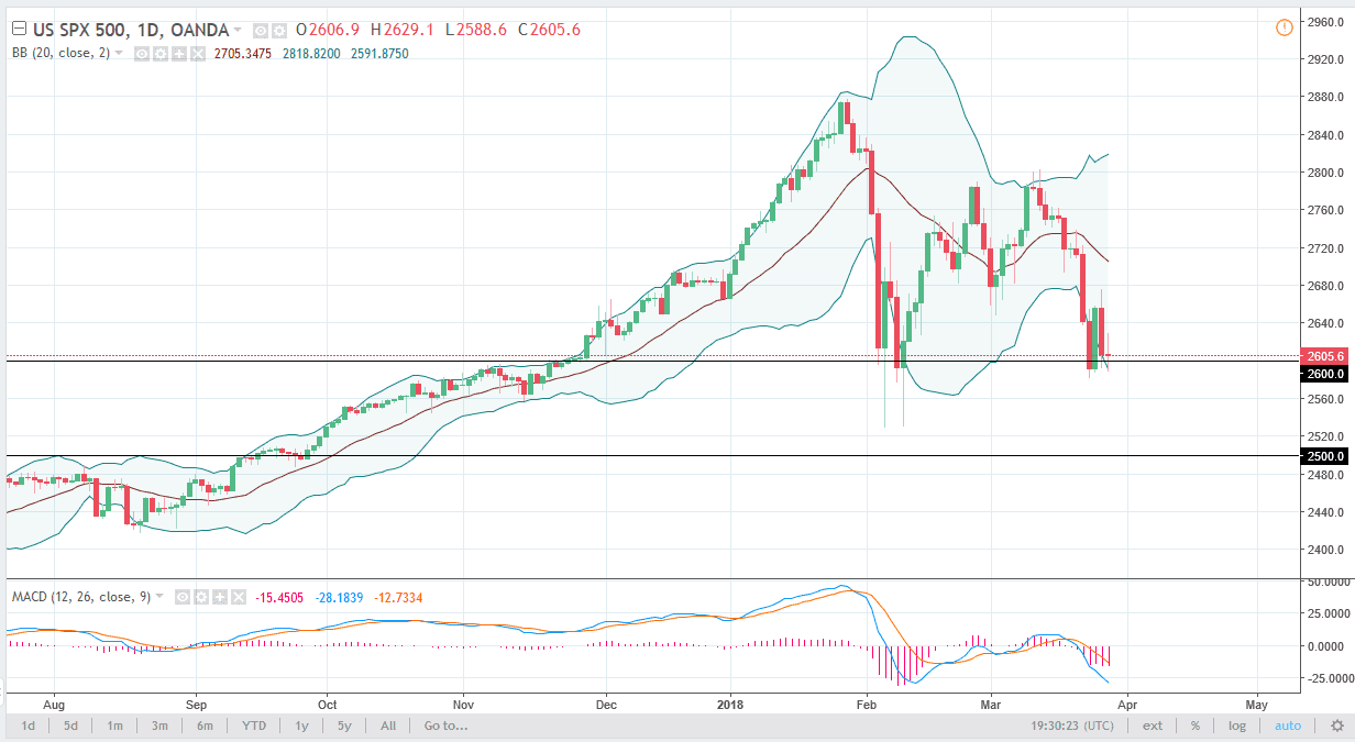 The S&P 500 went back and forth during the session on Wednesday, as we respected the 2600 level as support. This is an area that seems to be attracting a lot of attention, so I believe that if we can stay above there, the market will try to reach towards the 2700 level, perhaps even the 2800 level. If we break down below the 2600 level, we could have plenty of support show up somewhere near the 2500 level, as it is an area that has been important more than once. However, what I find the most interesting about this chart is that we have sat still at this area, showing that perhaps the market is finally calming down. I believe that the longer we go sideways, the better off this market’s going to be and potentially we could go higher as a result. I believe that this market will also move based upon talks about a potential trade war. If we break above the 2680 handle, the market should continue to reach much higher.