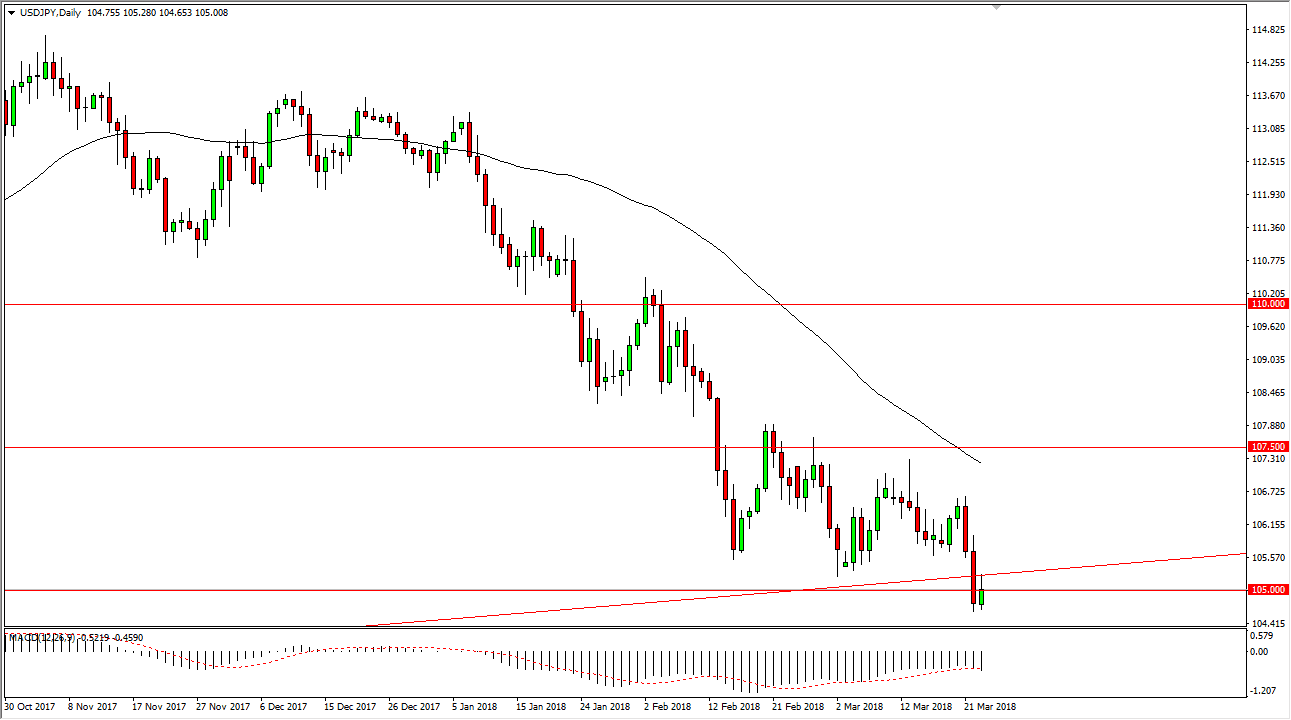 The US dollar initially rallied against the Japanese yen on Friday, reaching towards the previous uptrend line. However, we have found resistance there and turned around to form a bit of a shooting star looking candle. I think if we break down below the bottom of the candle, that should send the market much lower, perhaps down to the 101 level. This will be influenced by rhetoric coming out of both China and the United States, as we are currently watching a trade war try to form. If cooler heads prevail over the weekend, then I think that the market will probably break above the top of the range for the Friday session, which is a very bullish sign and could send this market towards the 107 handle. If things ratchet up in the trade war rhetoric, this market will break down. It can be difficult to measure these things, so the open today will be crucial.