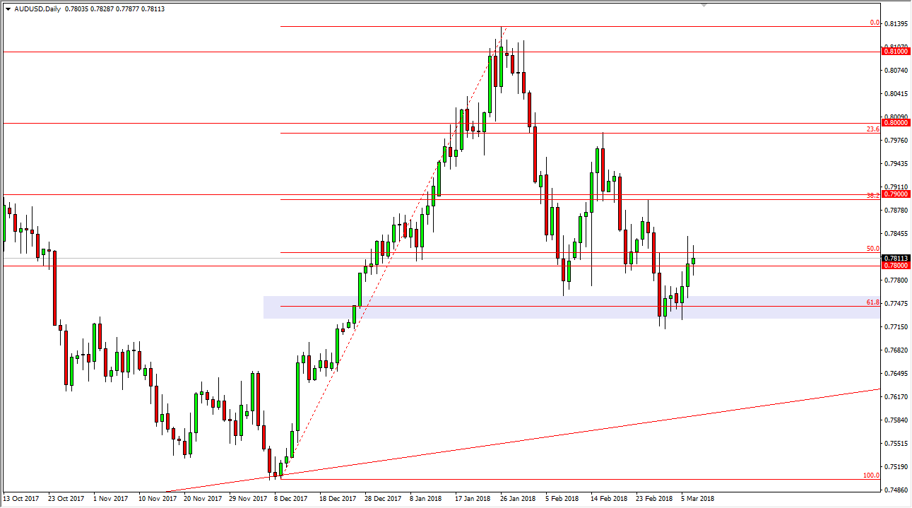 The Australian dollar went back and forth during the course of the session as well, and as you can see that we had formed a neutral candle, and I think at this point the 0.78 level is a bit of a magnet for price for the short term, but I also believe that eventually we will continue to go higher, perhaps reaching towards the 0.79 level next. If we broke above there, then it would show a massive amount of bullish momentum, perhaps reaching towards the 0.80 level. Longer-term, I think that happens but in general I believe that the market will continue to be very noisy. The 61.8% Fibonacci retracement level underneath is a “floor” in the market, so if we were to turn around and break down below there, the market would fall rather drastically. If gold rallies though, that should continue to be good for the Aussie. In the meantime, you might be best on the sidelines.