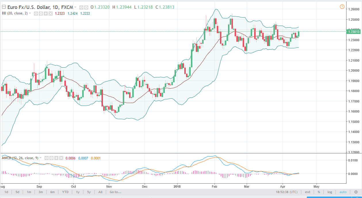 The EUR/USD pair rallied during the trading session on Monday, as we came back from the weekend with a bit of a sigh of relief after the situation in Syria doesn’t seem to be escalating, and it also looks likely that the rhetoric between the United States and China isn’t escalating either. Because of this, it looks as if we are trying to rally a bit. I think that the 1.25 level above is a significant barrier, but if we can break above there I think that the market would then go to the 1.32 level, based upon the breaking of the top of a bullish flag on the weekly chart. I believe in buying dips, and that the 1.22 level will offer a bit of a support barrier. That being said, it’s likely that we are going to be stuck in consolidation in general.