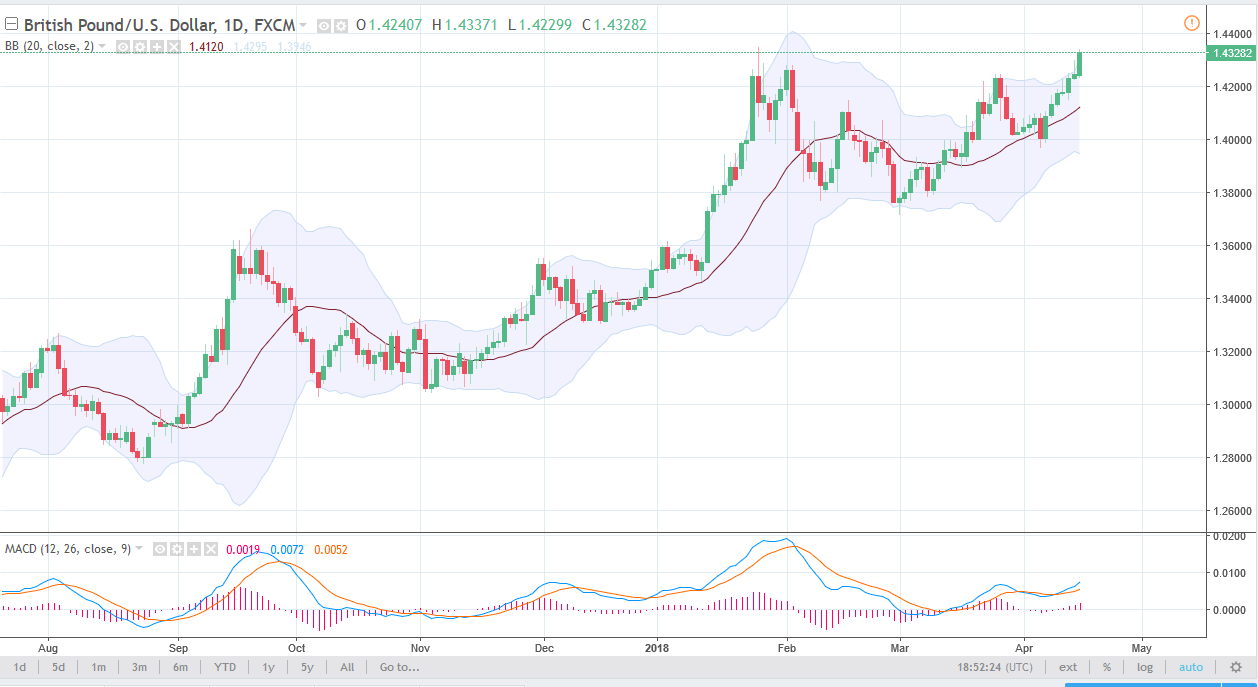 The British pound broke out to the upside during the trading session, clearing the 1.43 level. It looks as if we are ready to continue going higher, especially considering that we broke above the top of the shooting star from the Friday session. This is a very bullish sign, and I think that pullbacks will be thought of as buying opportunities. Based upon longer-term charts, I believe that we will go looking towards the 1.45 level above, which is a large, round, psychologically significant number, and of course has been structural resistance. If we can break above there, the market should continue to go to the 1.4750 level. I think that this market is supported all the way down to at least the 1.40 level, but I would be a bit surprised if we went that low. In general, I believe the pullbacks offer value.