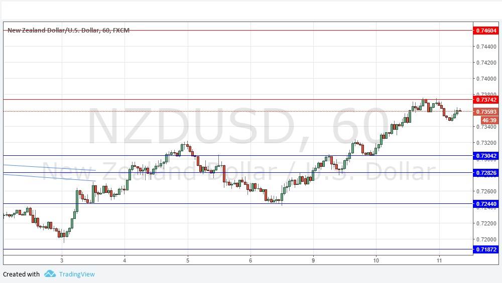 Yesterday’s signals produced a short trade following the bearish inside candlestick which rejected the resistance level I identified at 0.7374. It has now made the minimum 20 pips of profit required to break even.