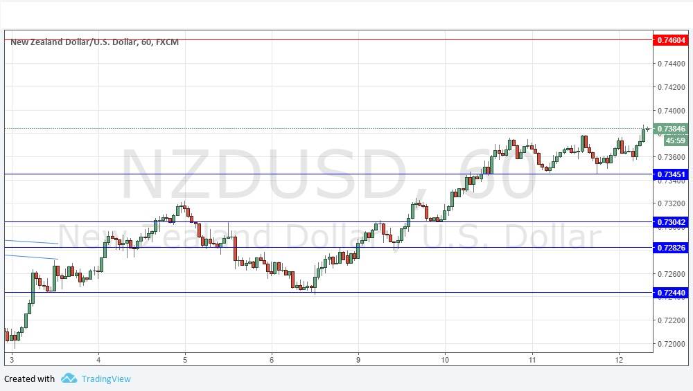 Yesterday I was less bullish, which was a mistake as the price has continued to rise strongly in line with the long-term bullish trend. The resistance level at 0.7374 has been invalidated and the price is making new highs as at the time of writing. There is a new higher support level at 0.7345 and the New Zealand Dollar is currently the strongest of all the major global currencies offered for trading by Forex brokers. Bullish, bullish, bullish.