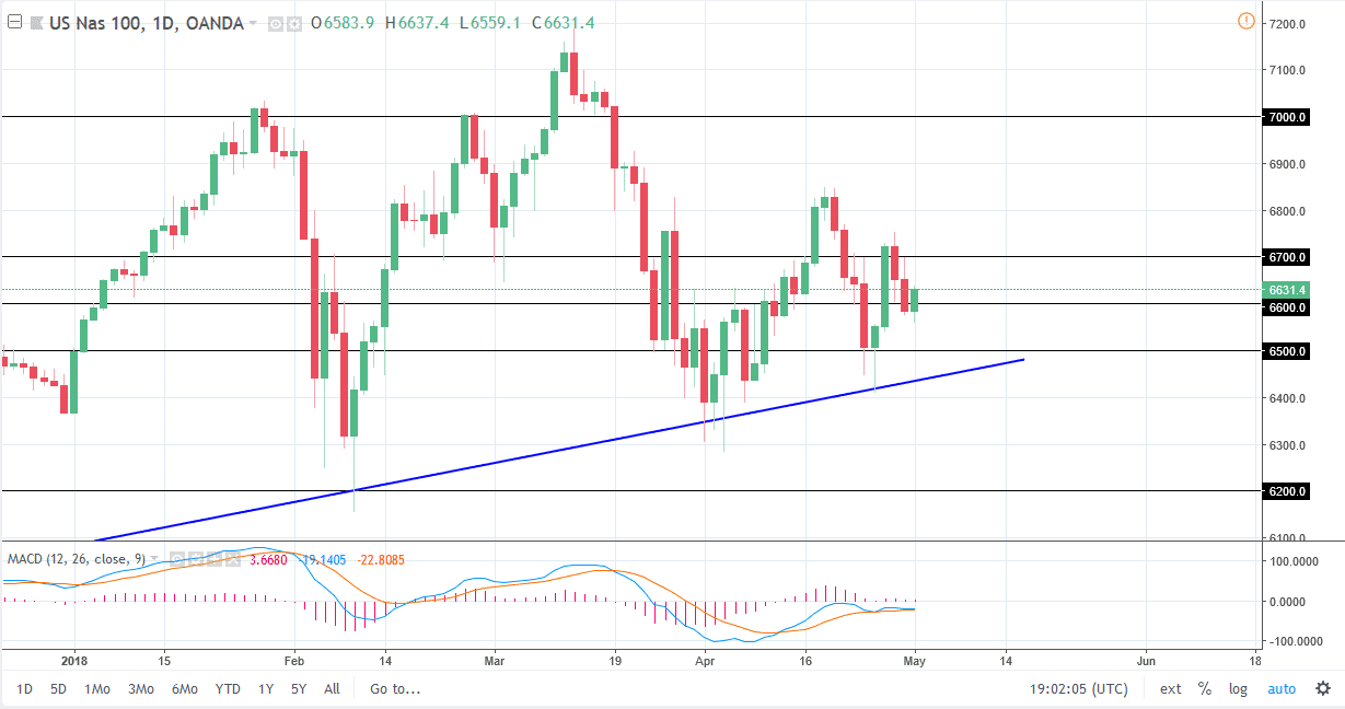 The S&P 500 had a rough trading session initially on Tuesday, as we reached to much lower levels, but found the area just above the daily trendline to be supportive enough to turn things around and form a hammer. The hammer of course is a bullish sign and I think that the attitude of traitor shows a certain amount of resiliency. I believe that the markets will probably be a bit choppy between now and Friday, as it is Nonfarm Payroll Friday, which of course causes a lot of noise. I think that we are trying to turn around and go to the 2675 level, but it’s going to be very difficult. Short-term pullbacks are probably buying opportunities, but if we were to break down below the 2600 level, the market probably unwinds rather drastically.