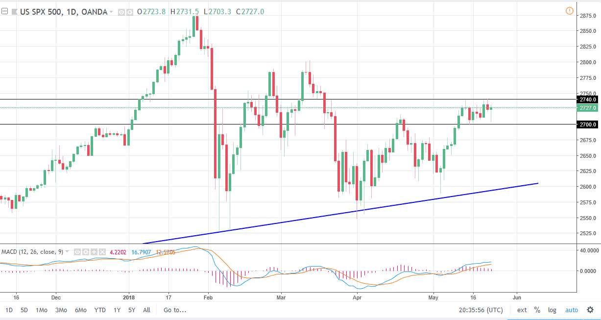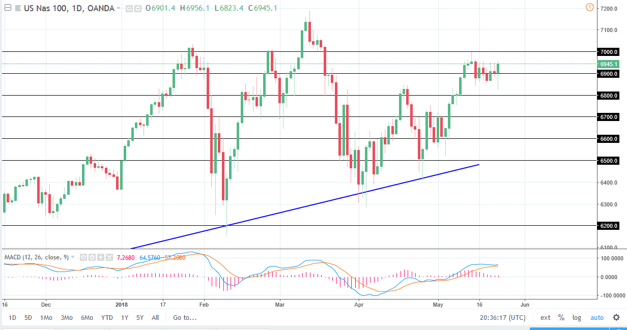 The S&P 500 initially fell during the day on Wednesday, reaching towards the 2700 level before bouncing significantly to form a massive hammer. This tells me that the market is ready to continue going higher, and that we will eventually break above the 2740 level, sending the market towards the 2800 level after that. I believe that short-term pullbacks continue to offer buying opportunities, as the 2700 level has started to act as a major “floor” in the market. I believe that a lot of the negativity was due to statements made by Donald Trump about the potential of talks between the Americans and the Chinese, and that of course the Americans and the North Koreans, but that is conjecture and simply a negotiation tactic that people are reacting to. I think people came in to pick up value, and not only that traders may have reacted to a less bullish minutes coming out of the Fed than anticipated.