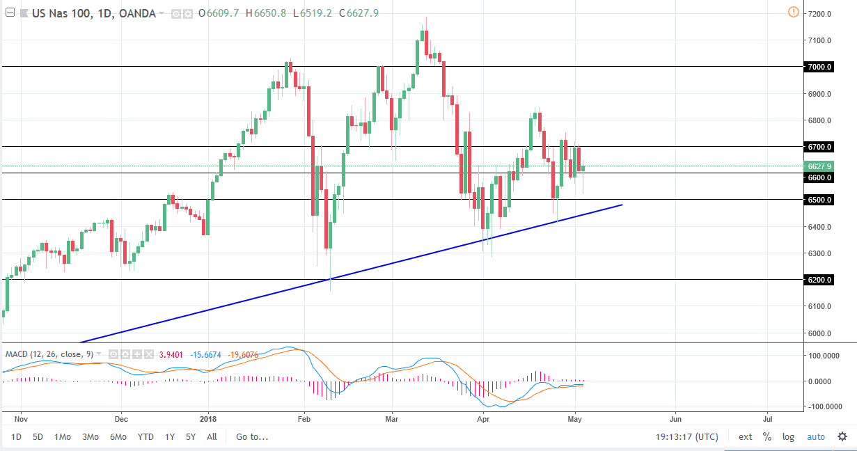 The NASDAQ 100 pulled back during the session as well, reaching as low as 6500, before turning around to form a massive hammer. The hammer is a very bullish sign, and I think that the market will try to go to the 6700 as a result. If we can break above 6725, the market is likely to continue to go much higher. Otherwise, we will test the uptrend line just below the 6500 level, and a breakdown below that level would be very catastrophic. I think that if that were to happen, you would see similar moves in S&P 500, Russell 2000, and Dow Jones 30 indices. I think longer-term though, we are starting to see value hunters come back in and if the jobs number is spot on, people won’t be as concerned about rising interest rates and should continue to try to grind to the upside. However, the jobs number is very strong, we could see this market break down little bit.