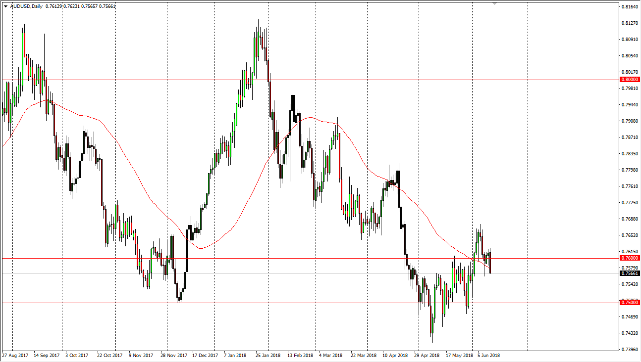 The Australian dollar has fallen rather hard during trading on Tuesday, slicing through the 0.76 level. However, there is a lot of support below at the 0.75 handle, and I think this could be a short-term move more than anything else. I anticipate that we will continue to see a lot of noise, and this is probably a reaction to Jerome Powell suggesting that there were going to be a rapid pace to interest rate hikes. However, I think at this point it’s likely that we will continue to see a lot of noise, and I think that sooner or later the buyers will come back, but this knee-jerk reaction certainly has the market rolling over quite a bit during trading. I think that the weekly charts and all of the hammer is that have been forming around the 0.75 level suggests that value hunters should come back.