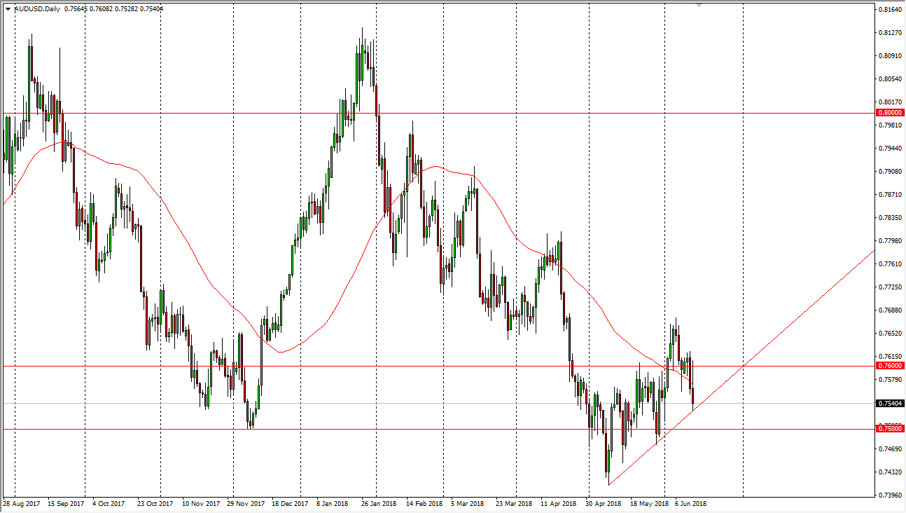 The Australian dollar initially tried to rally during the day on Wednesday but found the area above the 0.76 level to be a bit too much. We pulled back after the FOC statement, as it suggested that we were going to get more interest rate hikes coming out of America, but I think in the end that will be thought of as a “known quantity.” When I look at this chart, I can also see that there is a short-term uptrend line just below, and more importantly there were several hammers on the weekly chart that were based around the 0.75 level. If we made a fresh, new low, that would be an extraordinarily bearish turn of events, but right now I think that it’s likely that we will see a bit of resiliency in this market, as these things take some time. A fresh new low would send this market down to the 0.7250 level. If we continue to rally, then it becomes a longer-term situation for the buyers.