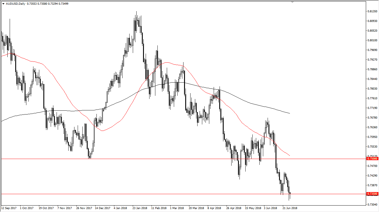 The Australian dollar fell initially during the session on Thursday, breaking below the psychologically important 0.7350 level. This area has been supported several times, and the fact that we bounced again towards the end of the day does suggest just how hard it’s can it be to break this thing down. If we can, the market is very likely to go down to the 0.73 handle, and then the 0.72 level. Longer-term, we could be looking at a move to the 0.70. Rallies at this point should be thought of as selling opportunities, unless of course we can break above the psychologically significant 0.75 handle.