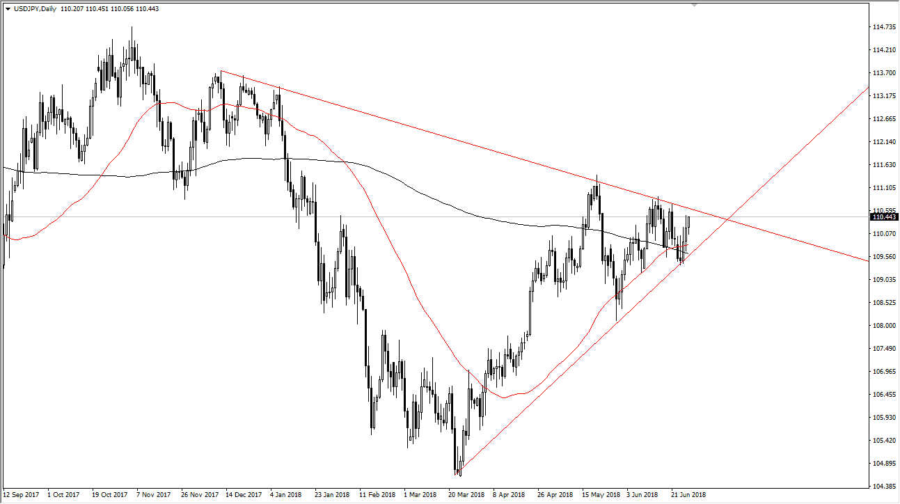 The US dollar initially pulled back against the Japanese yen on Thursday but rallied towards the ¥110.50 level during the day. I have a couple of trendlines drawn on the chart, and it seems as if we are currently stuck between these two trendlines, and therefore I think that we continue to see a lot of noise. That makes a lot of sense, because there are a lot of headline risk out there, involving trade tariffs and trade wars. All things being equal though, if we can get that to calm down, I believe this pair goes higher as we should continue to look at higher interest rates coming out of the United States while the Japanese central bank isn’t anywhere near normalizing monetary policy. If we can break above the ¥111 level, I think this market can go higher.
