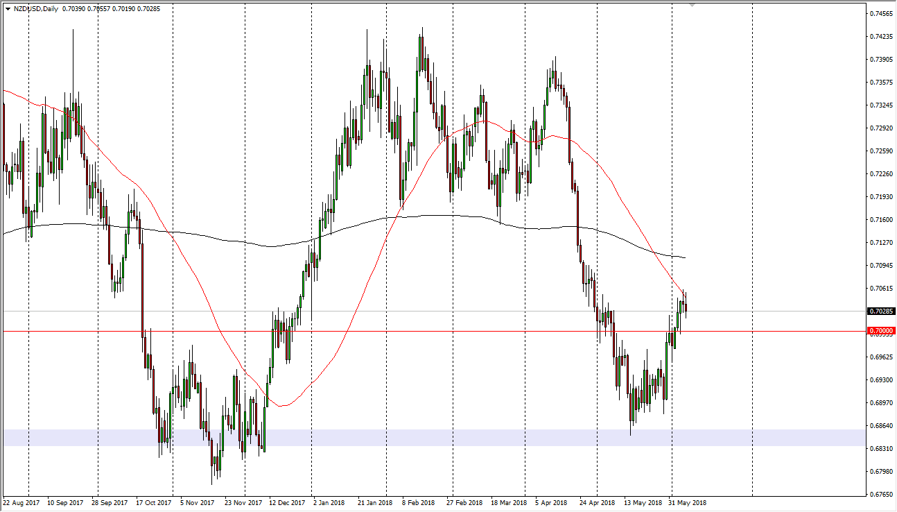 The New Zealand dollar initially tried to rally during the day on Thursday, but fell again to form a shooting star, just as it did during the day on Wednesday. The 50 day SMA has offered significant resistance, and at this point I think we could very well pull back a bit. If we do, I think the market probably goes down to the 0.70 level, which of course will attract a lot of attention. That should be a very supportive area, but if we break down below there I think the market should continue to go lower, perhaps reaching towards the 0.69 level. Alternately, if we can break above the Wednesday eyes, then the market should go to the 0.72 level over the longer-term. Remember, this pair is also highly sensitive to risk appetite.