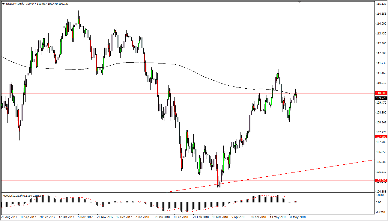 The US dollar fell against the Japanese yen during the trading session on Thursday, as the 200 day simple moving average continues to cause issues. Beyond that, the ¥110 level has been resistance more than once, and it will of course continue to cause a reaction occasionally. If we can break above the top of the shooting star from the trading session on Wednesday, the market should continue to go higher, perhaps reaching towards the ¥111 level rather quickly. If we break down below the lows of the session on Thursday, then I think the market probably fall and go looking towards ¥109 level. Remember, this pair is highly sensitive to the headlines around the world, and of course stock markets. I think that stock markets are going to pulled back slightly but should end up offering value. That should give this market a bit of a lift down the road. However, expect a lot of sideways action in the short term.