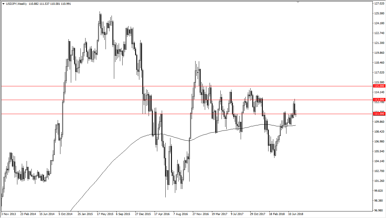 The US dollar has been very noisy against the Japanese yen over the course of the month for July, which makes a lot of sense as we continue to see a lot of noise when it comes to trade wars and currencies in general. Tariffs being levied against China and the US will affect global trade in a drastic manner, and that of course will affect this pair just like anything else. We had been rallying quite nicely but hit a bit of a “brick wall” at the ¥113 level. We pulled back from there, and the ¥111 level ended up being rather supportive. When I look at this chart, I think we are trying to rally from here, but I suspect that we will see a bit of weakness in the beginning part of the month at the very least.
