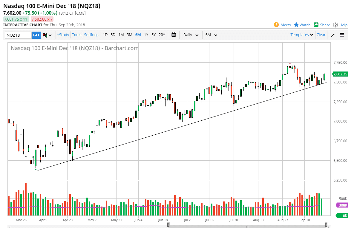 The NASDAQ 100 also rallied, reaching towards the 7600 level. The market has recently proven and uptrend line to be very supportive, and I think it’s only a matter of time before we go to the 7750 level again, which was the reason high. I think short-term pullbacks are buying opportunities, with massive support below at the 7475 handle. Overall, I don’t have any interest in shorting stocks right now, because they continue to show a type of resiliency that simply cannot be fought. If the market drops, I don’t look to sell, I look to buy at the first signs of life again. If we did break down below the 7475 handle, that could send the market down to the 7250 handle. That level should offer a significant amount of support, just that the 7000 handle will as well.