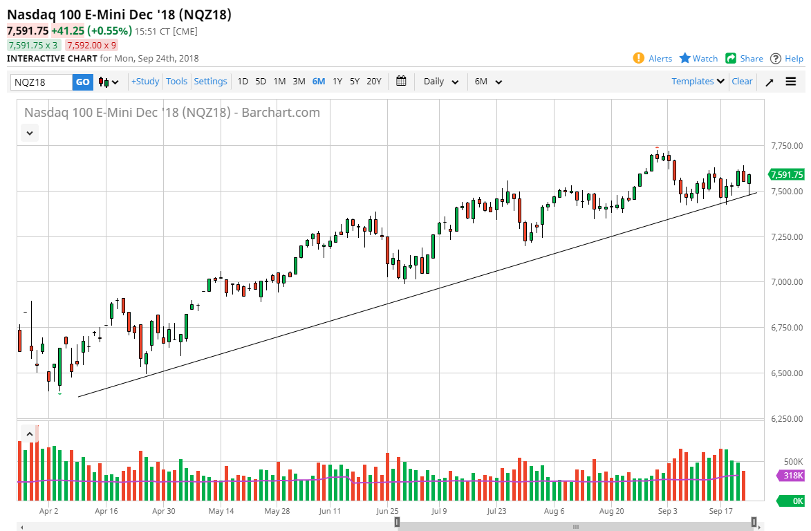 The NASDAQ 100 has pulled back initially during the day but rallied quite significantly to turn around and gain 0.56% by the time we closed. By bouncing the way it did off of the trend line, I believe that the NASDAQ 100 will continue to attract buyers underneath, and that short-term pullbacks offer value that we can take advantage of. If we break down below the uptrend line finally, then the market probably breaks down rather significantly. I suspect that this would coincide with the S&P 500, but right now it looks as if the NASDAQ 100 is trying to lead the way. If we can clear the 7635 handle, that would be a major victory for the buyers. Until then, I would expect a lot of consolidation.