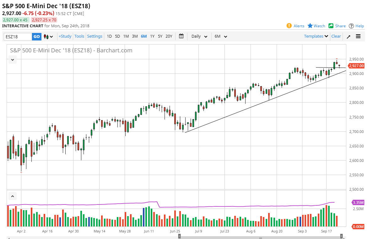 The S&P 500 gapped lower to kick off the session on Monday as the US/China situation continues to deteriorate. However, we did find a bit of support below at the 2920 area, forming a bit of a hammer. I suspect that the market is going to ignore yet again the Chinese situation. If that’s the case, this market will probably go looking towards the 2950 level. The underlying uptrend line of course offer support as well, so I think it’s difficult to sell this market for any length of time until we clear the 2900 level. If we do break down below that level, that would be a catastrophic turn of events and would probably open the floodgates to the downside. Ultimately, we do have a shooting star that formed on Friday, so I think what we are probably looking at is a lot of sideways choppiness over the next couple of days as we await the FOMC statement.