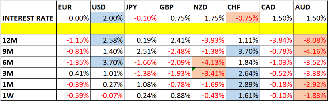 Let’s take a look at the relevant data of currency price changes and interest rates to date, which we compiled using a trade-weighted index of the major global currencies: