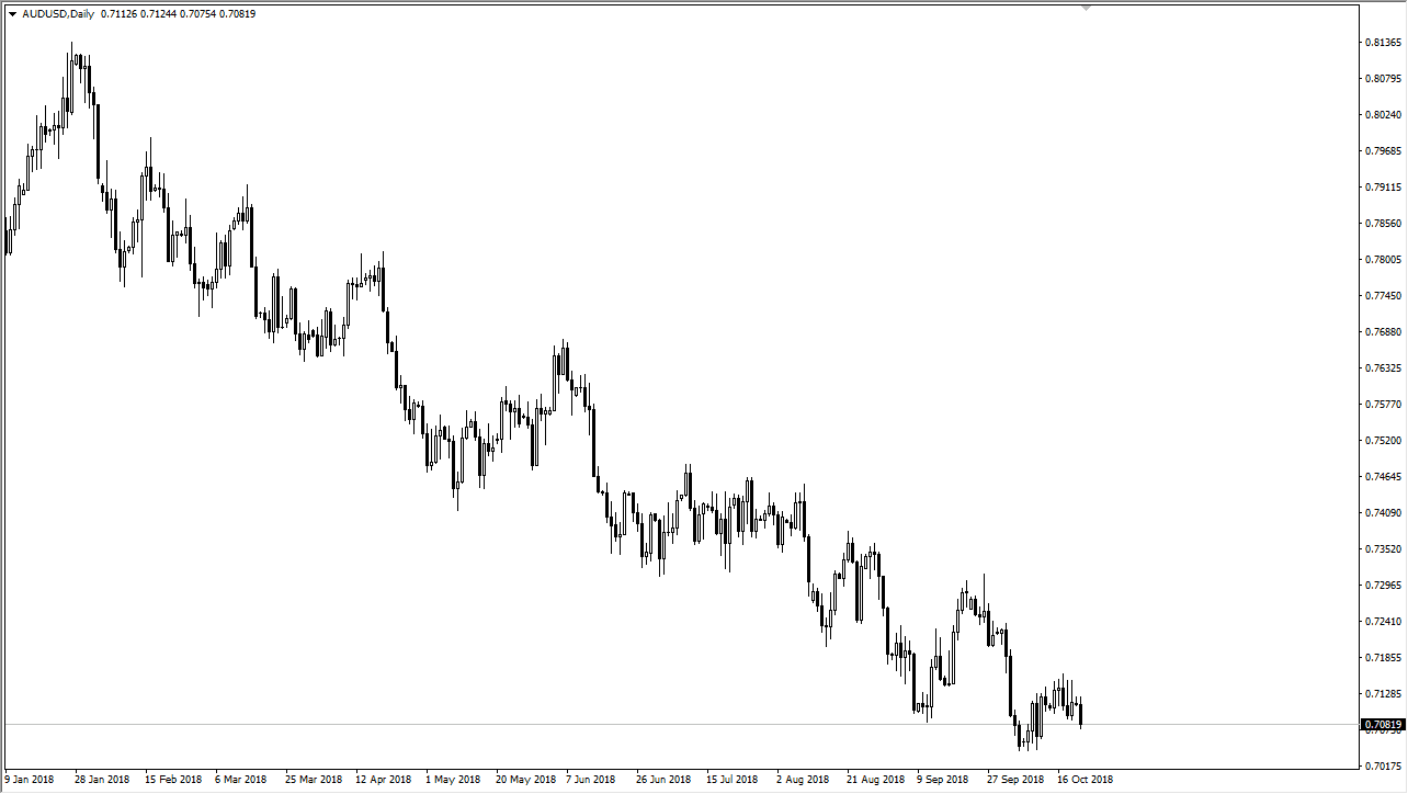 The Australian dollar has rolled over a little bit during the trading session on Monday, as we continue to focus on the Sino-American trade spat. That of course weighs upon the value of the Aussie dollar as it is so highly leveraged to the Chinese economy. With that being the case, the markets continue to struggle to find gains, and I think we are more than likely going to go looking towards the lows again at the 0.7050 level. A break down below there opens the door to the 0.70 level, and then possibly even as low as the 0.68 level. The alternate scenario is that we break above the 0.7150 level and then go looking towards the 0.70 level where I see a lot of supply.