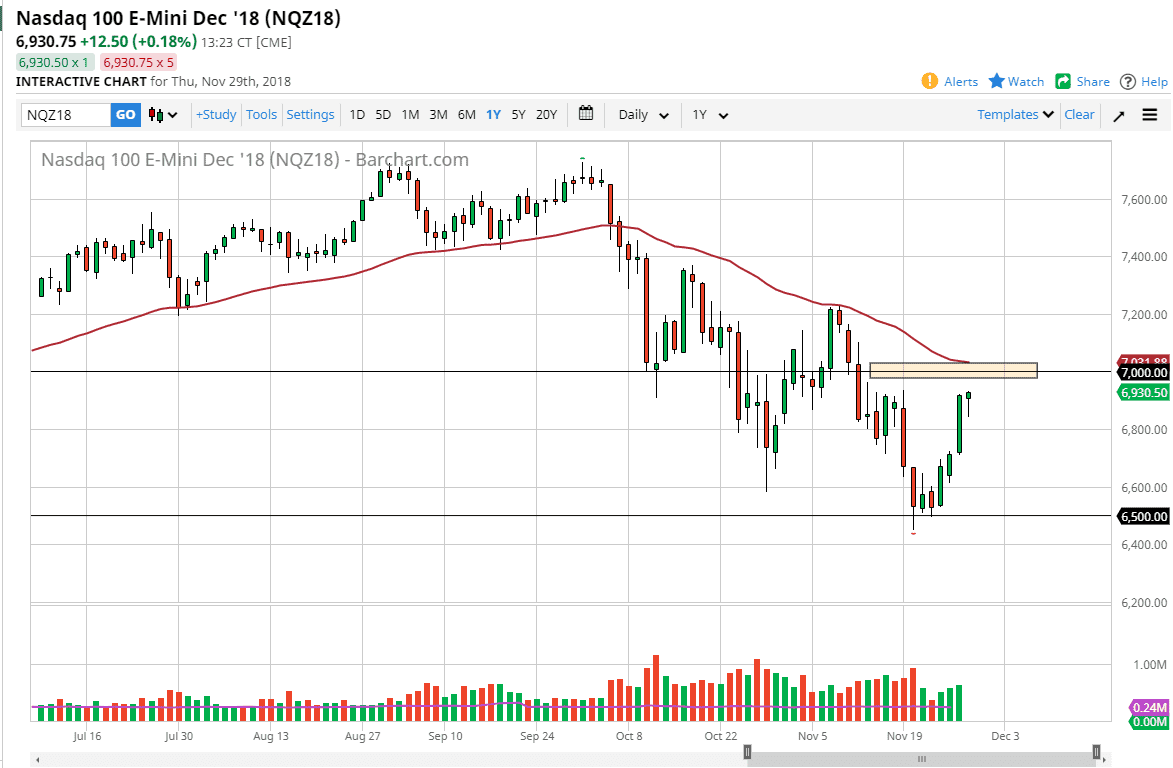 The NASDAQ 100 also initially pulled back during the trading session on Thursday, but then slammed into the resistance that we closed out the trading session on Wednesday with, and it now looks as if we are going to go looking towards the 7000 level above which of course is the 50 day EMA as well as a large, round, psychologically significant figure. The question now is whether or not the US and China can come together and give us some type of good news out of Argentina. If they do, I fully expect that the market will probably rally quite drastically, and the NASDAQ 100 could be a major beneficiary as it is composed of so many international technology companies. If we break the bottom of the candle stick from the Thursday session, that could be a very bad sign.