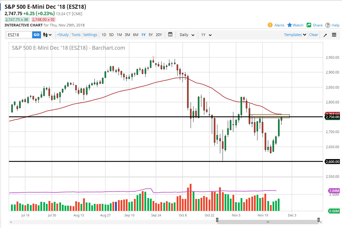 The S&P 500 initially pulled back during the trading session on Thursday but then turned around to slam into the 2750 level. This is an area of significance, as it not only is an area of resistance in the recent past, but it’s also been support. Beyond that, the 50 day EMA is hanging around this figure and after the Meeting Minutes from the FOMC, market participants are starting to get in their head that perhaps the Federal Reserve is starting to leave a door open to be able to keep interest rates low for a while. However, we still have the G 20 meeting over the weekend, and it’s going to be difficult to feel completely safe and secure going long until we get through it. If we can get some type of an agreement between the Americans and the Chinese, that could be the reason we go higher.