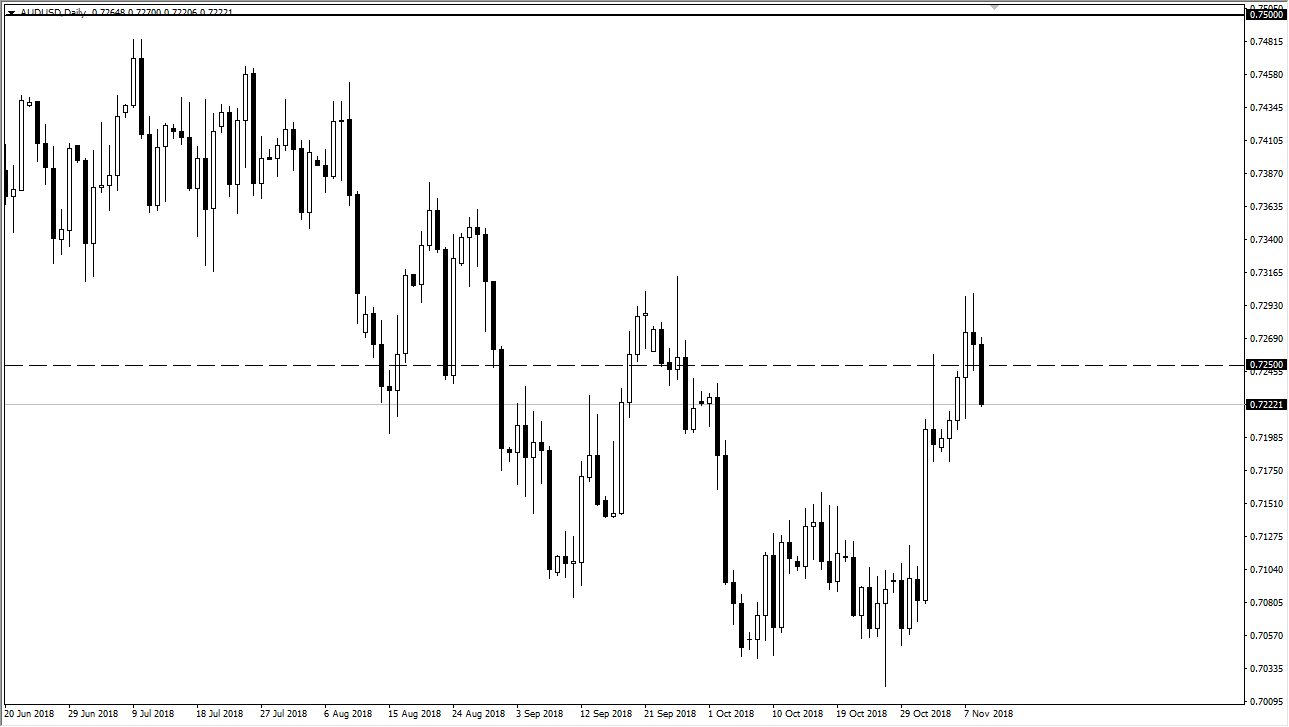The Australian dollar has been at the mercy of Sino-American trade relations for some time, and although we have seen a massive rally as of late, it looks like the 0.73 level is going to be a bridge too far as it were for the buyers. By breaking below the Thursday candle, we have set in some bearishness in this pair, and I would expect a little bit of follow-through, perhaps even accelerating if we get bad headlines over the weekend involving either China or the United States. I believe the market has gotten ahead of itself, because quite frankly I don’t expect much out of the meeting between the Americans and the Chinese in Argentina.