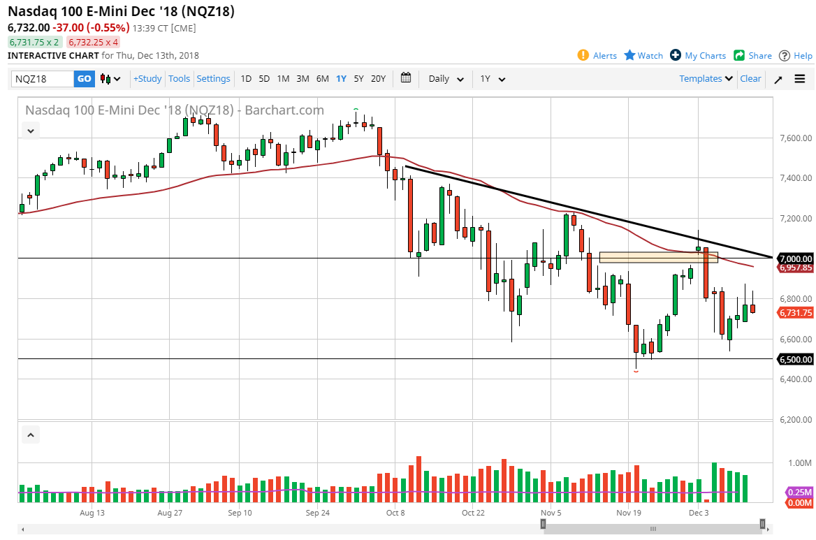 The NASDAQ 100 initially tried to rally during the trading session on Thursday, running into resistance at the 6800 level. We gave back the gains though and rolled over to form a bit of a shooting star. This market continues to struggle and I think it’s only a matter of time before the NASDAQ 100 will roll over due to the Sino-American trade spat. At this point, the 50 day EMA is appointed decidedly to the downside, and we have a downtrend line just above there. I think it’s only a matter time before rally selloff, and although the NASDAQ 100 had outperformed the S&P 500, I believe this is an ominous sign for stock markets overall as suddenly we are struggling to hold gains over here as well. I think the 6500 level underneath is massive support, so if we were to break down below there it’s likely that we could go much lower.
