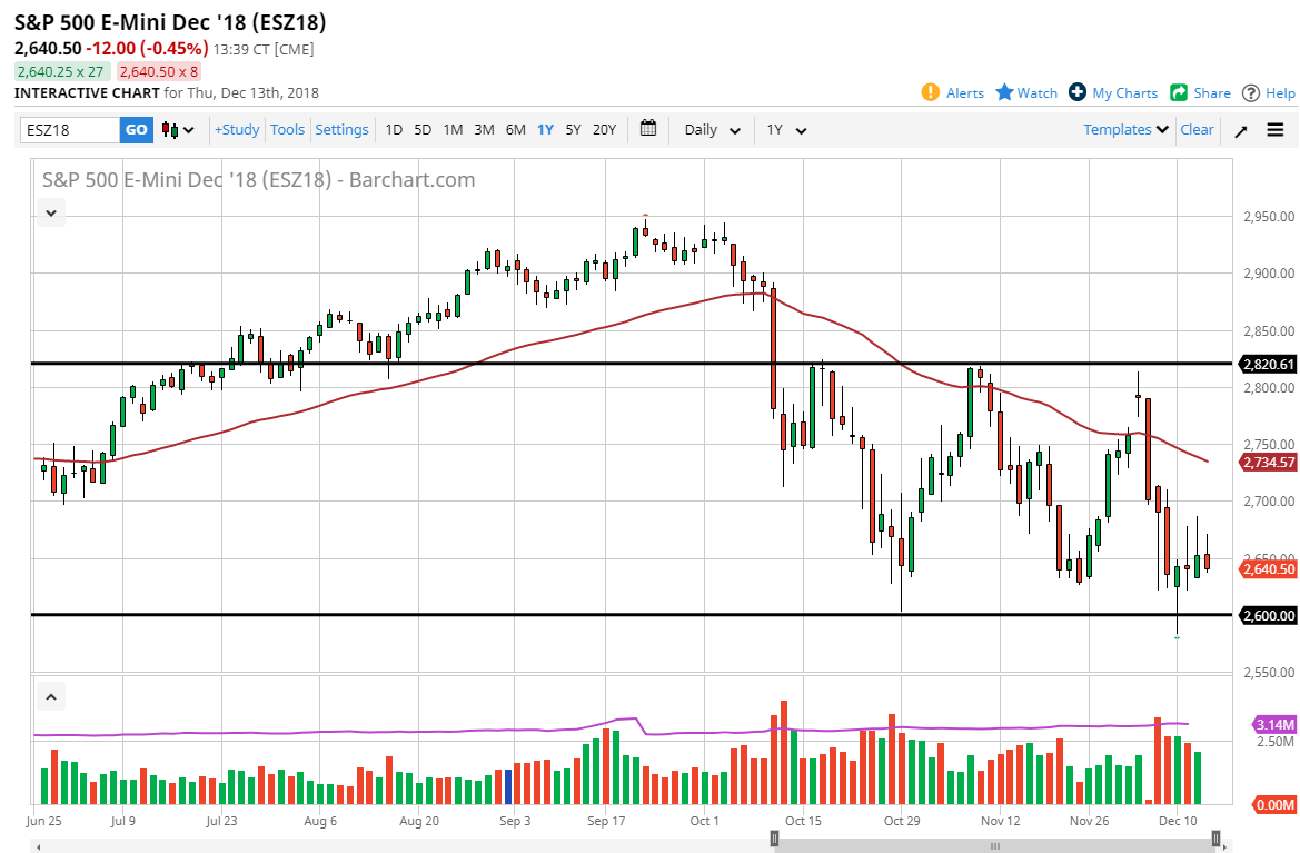 The S&P 500 initially tried to rally during the trading session on Thursday, but as we have seen more than once, we have given up the gains to roll over later in the day. It’s obvious that the S&P 500 simply cannot keep gains, so therefore I think that rallies are to be sold that show signs of exhaustion. At this point, if we can break above the highs of the Wednesday candle, then we will test the 2700 level, and a break above there would send the market to test the 50 day EMA. Overall, I think we are destined to make another crack at the 2600 level based upon the really bad action that we have seen over the last couple of days. The buyers simply have no conviction or follow-through at this point.