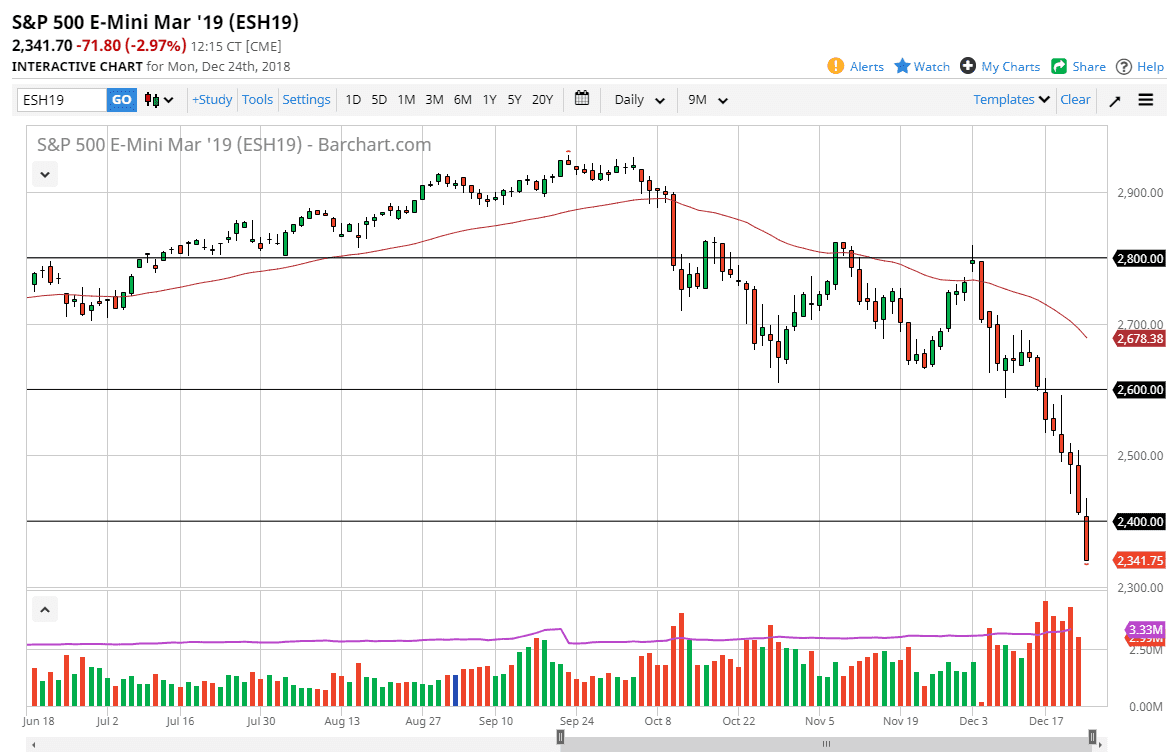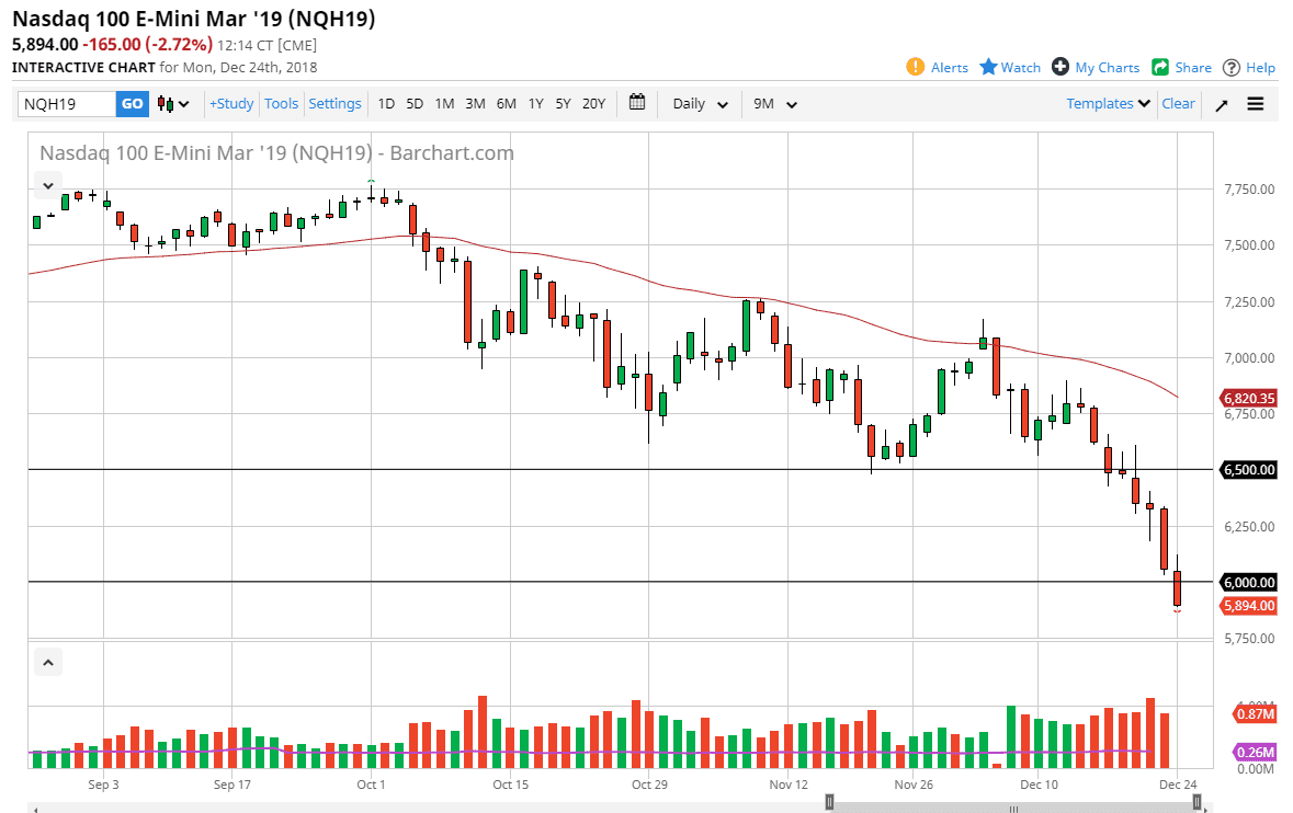 The S&P 500 initially tried to rally in the futures market on Monday, but then got hammered and we sliced through the 2400 level. That level was a target based upon the previous consolidation between 2600 and 2800 above, and now that we have broken through that it looks like we are seeing even more bearish pressure. The S&P 500 looks absolutely horrible, and although we will more than likely bounce, it should just be a nice selling opportunity happening. This is a market that is most certainly in a bearish trend and trying to buy it down at these extraordinarily low levels is a fool’s errand. Look for rallies that show signs of failing to start shorting again. I would anticipate that the 2400 level above should be resistance, followed by 2500.