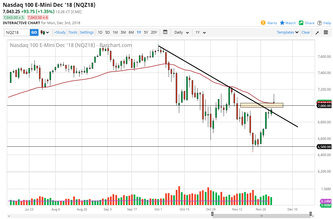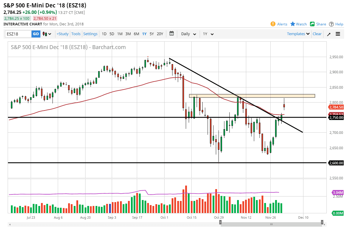 During the weekend, the Americans and the Chinese have come to an agreement to put a 90 day moratorium on fresh new tariffs, which of course is exactly what the market was hoping. Because of this, the market gapped at the open and reach towards the resistance above that has been so important for a while. The 2825 level is a significant barrier that might be difficult to clear, but if we do break above that level, then I think we will continue to go much higher, kicking off what would be the beginning of the hopeful “Santa Claus rally.” In the short term, I think we very well could pull back to fill the gap though, meaning that a little bit of patience might be able to offer profits if you can buy from lower levels. I think that the 2750 level should be supported.